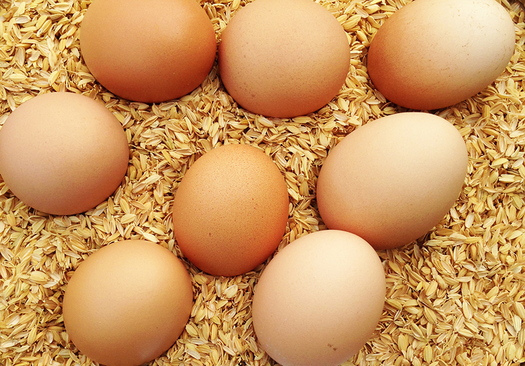 ニワトリが気持ちよく暮らせるよう、太陽の光・風が通る大地の上、広い鶏舎での平飼い。エサは当農場で採れた野菜と自家製配合飼料と自家製発酵飼料を与えています。