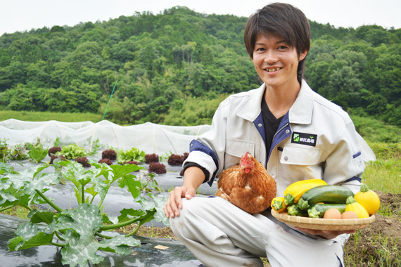 農薬・化学肥料を一切使用せず、年間約70種類の野菜と米、卵を生産しています。